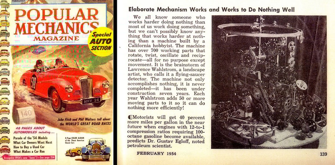 «Машина, що нічого не робить» - це самостійний напрям техноарту, заснував який годинникар-аматор Лоуренс Валстром (Lawrence Wahlstrom). Саме він створив інженерне диво, яке назвав «Do Nothing Machine».