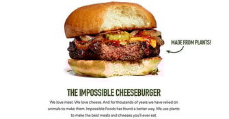 Проєкт Патріка Брауна Impossible Foods пропонує не просто смачну їжу, а корисну: без холестеролу, гормонів і антибіотиків. Флагманський продукт компанії - чизбургер із рослинних продуктів.