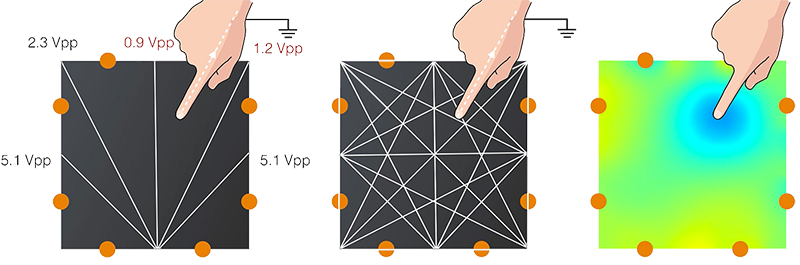 Принцип зондування поверхні заснований, як заявляють розробники, на «томографії електричного поля» (electric field tomography). Працює це так. Електропровідна поверхня оточується низкою електродів (від 8 до 16, залежно від розміру поверхні). На сусідню пару електродів подається невеликий струм і вимірюється напруга на інших парах. Цей цикл повторюється для наступної пари електродів, потім для наступної і так далі. Коли палець торкається поверхні, він змінює локалізовані напруги в кожному циклі вимірів, і, прорахувавши всі ці виміри з усіх циклів, можна обчислити розташування точки торкання на двовимірній поверхні.