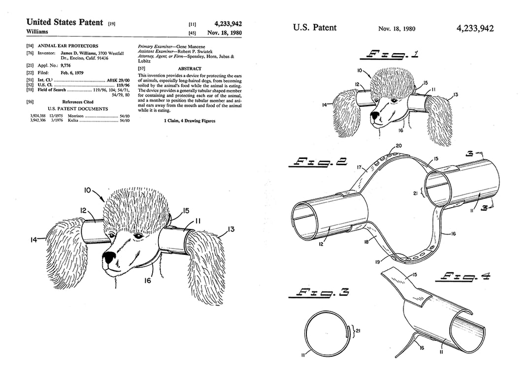 Напевно, саме такий собака був у Джеймса Вільямса з Каліфорнії. Мабуть, це і навело його на думку зробити пристрій для підтримки довгих вух під час годування собаки.