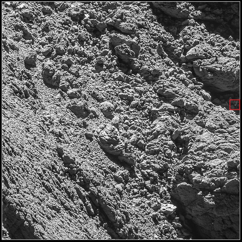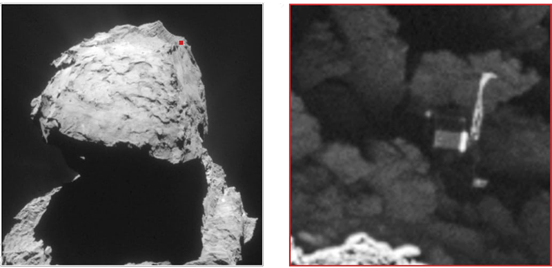 Після складної посадки на комету, візуальний контакт з посадковим модулем був втрачений. Вчені не змогли визначити, де ж все-таки «заякірувався» модуль. Результати огляду камерами і дані вироблення енергії сонячними батареями показали, що це досить темне місце і запасу батарей вистачить на дві-три доби.
